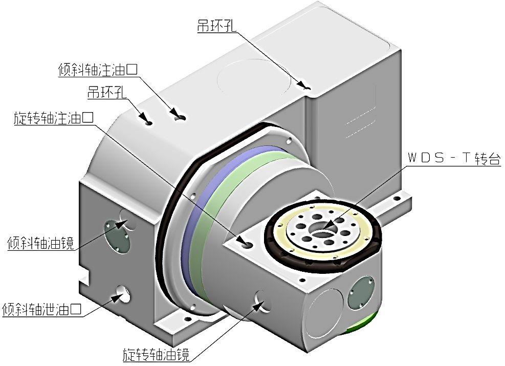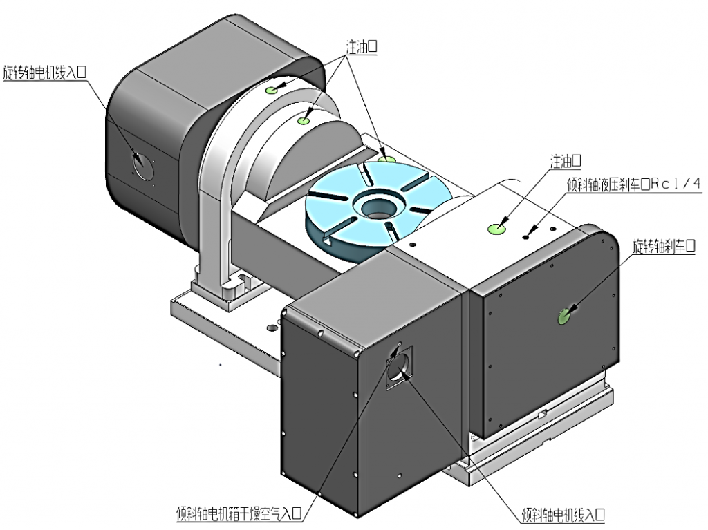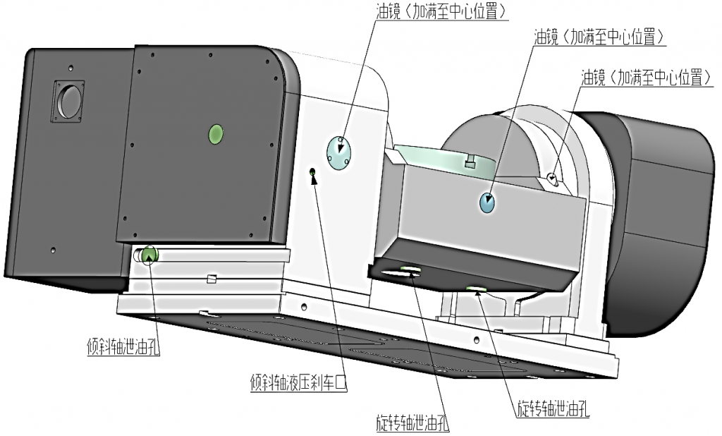 打開轉(zhuǎn)臺(tái)附帶的說明書在目錄中找到【潤滑】一項(xiàng),按照其中注明的放油口和進(jìn)油口操作,轉(zhuǎn)臺(tái)上也有相應(yīng)的標(biāo)識(shí),以下是說明書中標(biāo)識(shí)的范例: