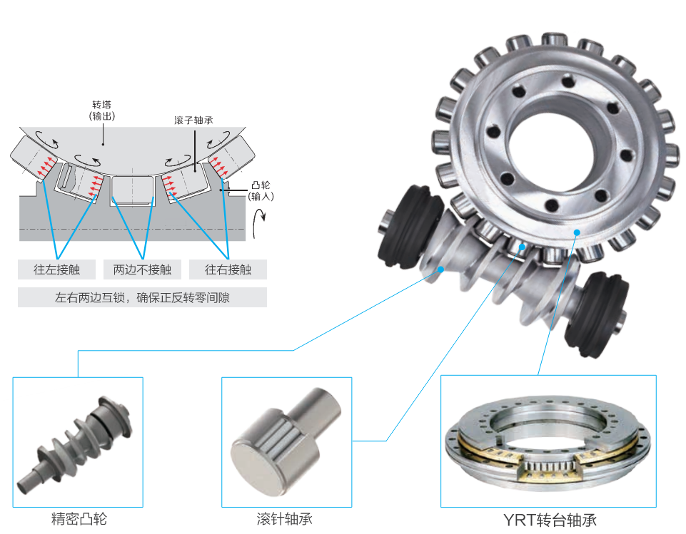 滾子與凸輪接觸面大 → 剛性比蝸輪蝸桿結(jié)構(gòu)轉(zhuǎn)臺更高