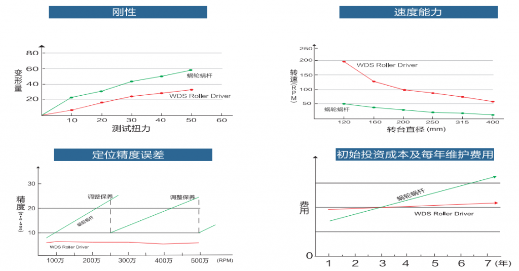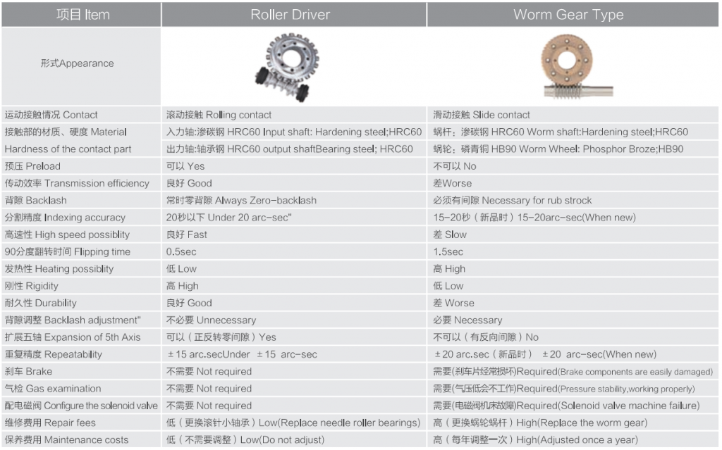 目前市場上的轉(zhuǎn)臺產(chǎn)品以蝸輪蝸桿結(jié)構(gòu)為主。渦輪材料為磷青銅,無法加預壓,剛性差,隨著使用磨損整個轉(zhuǎn)臺精度不斷下降,導致極高的后期維修成本,給機床用戶及代理商都帶來很多困擾和經(jīng)濟損失。要規(guī)避蝸輪蝸桿結(jié)構(gòu)的缺點,蝸輪蝸桿的材料需要特殊處理(如日研、雷曼等高端品牌),但價格昂貴,一般客戶無力承擔。
